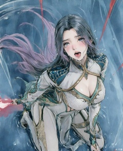 ((very awa)),(solo),highly detailed,(best quality),((masterpiece)),1girl,chi,,ge,,traditional media,painting \(medium\),watercolor \(medium\),looking_at_viewer,large breasts,,wangqiuer,long hair,clothing cutout,rolling_eyes,garter_straps,tears,kneeling,breast,cleavage,navel,tongue_out,ahegao,blush,drooling,