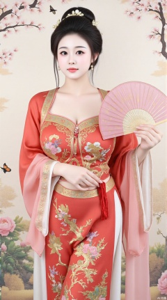A plump classical and slightly fat beauty, wearing a gorgeous red palace outfit, her clothes were embroidered with exquisite golden phoenix patterns, and her skirt was mopping the floor. She was combed in a tall bun, with several jade hairpins, and pearl earrings. Melon-shaped face, phoenix eyes, cherry mouth, and fair skin as white as snow. She stood in the palace garden holding a pink round fan, surrounded by blooming peonies and flying butterflies. The picture adopts the style of traditional Chinese fine brushwork, with bright colors and delicate lines, and pays attention to detailed descriptions, such as the texture of the clothes, the petals of the flowers, etc.