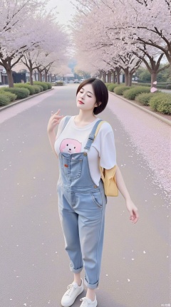 A slightly fat girl with shoulder-length short hair, with a round face and cute dimples. She was wearing a white short-sleeved T-shirt with a pink cartoon pattern on it, paired with light blue overalls, a pair of white sneakers and a yellow backpack on her feet. She stood on a street full of cherry blossom trees, with cherry blossoms falling one after another, and a layer of pink petals were covered with. The girl looked up at the falling cherry blossoms, her eyes full of surprise and happiness. The tones of the picture are fresh and soft, mainly pink and white, creating a romantic and sweet atmosphere.