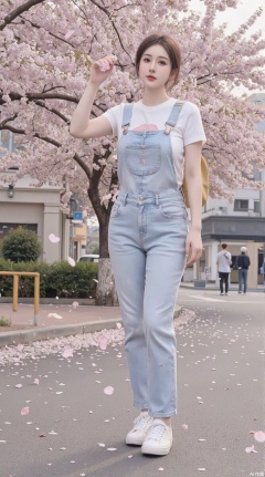A slightly fat girl with shoulder-length short hair, with a round face and cute dimples. She was wearing a white short-sleeved T-shirt with a pink cartoon pattern on it, paired with light blue overalls, a pair of white sneakers and a yellow backpack on her feet. She stood on a street full of cherry blossom trees, with cherry blossoms falling one after another, and a layer of pink petals were covered with. The girl looked up at the falling cherry blossoms, her eyes full of surprise and happiness. The tones of the picture are fresh and soft, mainly pink and white, creating a romantic and sweet atmosphere.