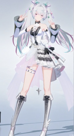 1girl, solo, long hair, breasts, looking at viewer, smile, bangs, skirt, hair ornament, long sleeves, dress, bare shoulders, twintails, standing, full body, white hair, multicolored hair, boots, frills, detached sleeves, sleeveless, pink eyes, white dress, see-through, thigh strap, white footwear, white skirt, knee boots,karenina/(PGR)