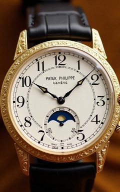 Watch, A close-up photograph of a vintage-style gold wristwatch with an ornate, intricate design. The watch face features black Roman numerals, a white background, and a detailed moon phase display at 6 o'clock. The hands are black, and the brand "Patek Philippe Genève" is engraved. The background is a soft, blurred brown gradient.