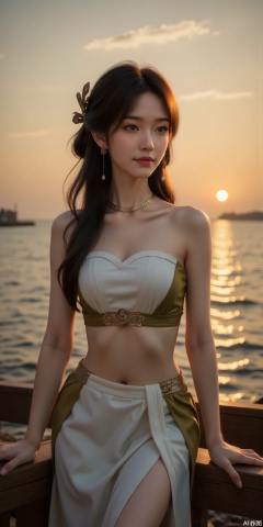 best quality, masterpiece, realistic,cowboy_shot,(Good structure), DSLR Quality,Depth of field,kind smile,looking_at_viewer,Dynamic pose, 1girl, solo, long hair, , looking at viewer, skirt, hair ornament, bare shoulders, jewelry, , , earrings, outdoors, midriff, water, necklace, lips, crop top, grey eyes, leaning forward, ocean, white skirt, strapless vest, sunset, sun,meining,brown hair