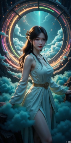 A dynamic AIDA_FXLR_ElonaV,emerges from a spiraling vortex portal of rainbow colors smoke and sparkles,bathed in voluminous light that casts angular shadows across the composition. She is partially obscured by the smoke. She wears a white lace dress. The AIDA_FXLR_ElonaV's pose is energetic and fluid,as if propelled through the wispy fog by an unseen force. The atmosphere is electric,with the cyan haze imbuing the scene with an air of mystery.,angular lines. realistic,masterpiece,high quality,best quality,high resolution,highly detailed,HDR,UHD,vivid colors,slender,,huge_breasts,meining,hair ornament,brown hair