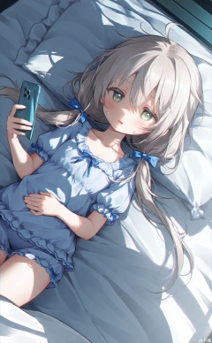 masterpiece,very aware,highres,absurdres,newest,best quality,high quality,loli,petite,chromatic_aberration,cinematic_angle,dutch angle,Light Blue Theme,//,1girl,phone,cellphone,green eyes,solo,grey hair,holding phone,holding,smartphone,long hair,open mouth,pajamas,twintails,short sleeves,under covers,low twintails,blue bow,hair between eyes,hair bow,bow,blue shirt,puffy sleeves,blue pajamas,blanket,bed sheet,shirt,sweatdrop,ahoge,puffy short sleeves,on bed,blush,//,//,,