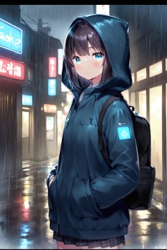 1girl, solo, looking at viewer, black hair, jacket, outdoors, hood, bag, glowing, backpack, letterboxed, hooded jacket, hood up, rain, hands in pockets