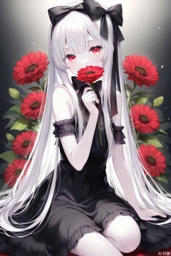 1girl, solo, long hair, looking at viewer, bangs, red eyes, dress, bow, holding, bare shoulders, sitting, very long hair, flower, white hair, hair bow, black dress, black bow, red flower, pale skin, holding flower