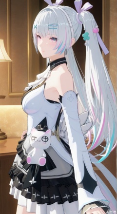masterpiece,bestquality,4k,3d,animescreencap,{{masterpiece}},illustration,best quality,extremely detailed cg unity 8k wallpaper,original,high resolution,{{{{{extremely delicate and beautiful girl}}}}},karenina/(PGR),1girl, solo, long hair, breasts,bangs, skirt, hair ornament, long sleeves, dress, bare shoulders, twintails, white hair, multicolored hair, frills, detached sleeves, sleeveless, pink eyes,from side