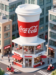 mlmnjd, This is a CGI illustration depicting a modern, white, two-story Coca-Cola kiosk with a large, red-striped cup on the roof. The kiosk is surrounded by a bustling cityscape with diverse buildings, pedestrians, and a red scooter. The kiosk has a Coca-Cola sign and outdoor seating with umbrellas.<lora:迷你街道-L1.04:1>