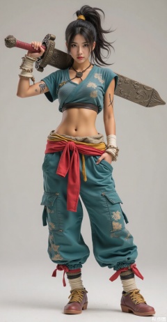 1girl,carrying a big sword on her shoulders, black hair, breasts, clothes around waist, crop top, full body, jewelry, lips, medium breasts, midriff, navel, ponytail, realistic, solo, standing, tattoo, wristband,Pants,shoes,