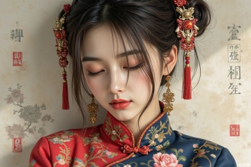 1girl, black hair, eyelashes, floral print, realistic, closed eyes, closed mouth, hair ornament, tassel, solo, red lips, chinese clothes,