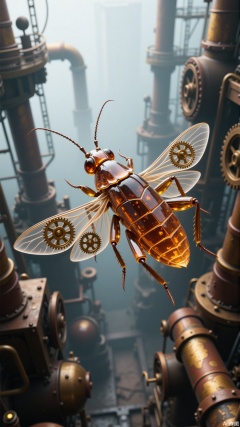 a steampunk-style insect, likely a cockroach, flying amidst a backdrop of industrial machinery