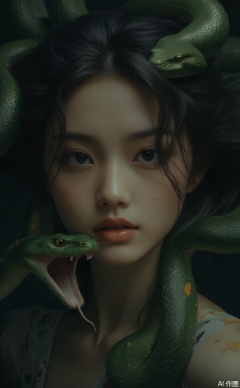 side view, head tilted, a highly detailed digital painting of a young woman with fair skin and freckles, featuring a strikingly realistic style. She has long, dark, wavy hair and expressive green eyes. Her lips are full and slightly parted, giving her a serene yet enigmatic expression. Surrounding her head are three large, green snakes with orange spots, their forked tongues extended as if they are about to taste the air. The snakes' scales are intricately detailed, adding texture to the image. The woman is wearing a light-colored, floral-patterned dress that contrasts with the dark, almost black background. The camera angle is a close-up, focusing on her face and the upper part of her body, with the snakes coiled around her head and shoulders. The lighting highlights her smooth skin and the glossy texture of the snakes' scales, creating a dramatic and slightly surreal atmosphere.