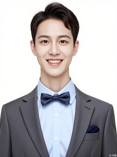 A professional-looking headshot of a young Hispanic man with a clean-shaven face and a friendly smile. He's in a charcoal gray suit with a light gray dress shirt and a navy blue pocket square. The backdrop is a solid white, and the soft lighting creates a gentle contrast, making his features stand out.