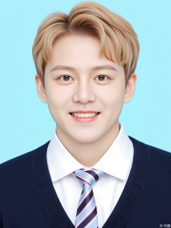 A headshot of a young Caucasian man with short, blond hair and a determined look in his eyes. He's dressed in a white dress shirt with a red and blue striped tie under a navy blue cardigan. The background is a light baby blue, and the lighting is focused on his face, bringing out his strong jawline.