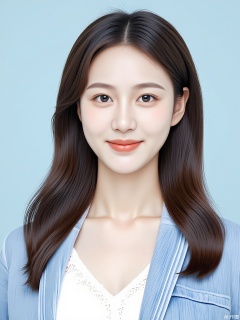 A portrait of a young mixed-race woman with long, dark brown hair and a center part. She wears a white lace top under a light blue denim jacket. The backdrop is a pale sky blue, and the soft lighting brings out the delicate details of her lace top and the innocence in her eyes.