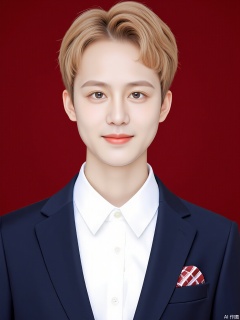 A charming close-up of a Caucasian boy with tousled blond curls and a mischievous glint in his eyes. He wears a white dress shirt with short sleeves, featuring a small red pocket square peeking out. Over it, he sports a navy blue sailor-style jacket with golden buttons. The background is a deep, rich red, and the lighting accentuates his playful charm and the dimples in his cheeks when he smiles.
