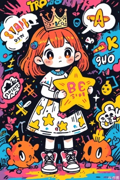 Graffiti,Cute little girl holding a huge star , with big eyes ,huge stars , glowing stars, doodle in the style of Keith Haring, sharpie illustration, MBE illustration, bold lines, in the style of grunge beauty, mixed patterns, text and emoji installations