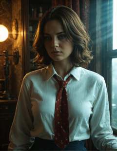 masterpiece,high quality,8k, photo,(realistic skin:1.2),(pores:1.2),cinematic,volumetric lighting,portrait shot,1girl,bioshock, Elizabeth Comstock,shirt,tie,skirt,upper body,looking at viewer,window,sunray,godsray,gloomy,cloudy,cool temperature,cleavage
