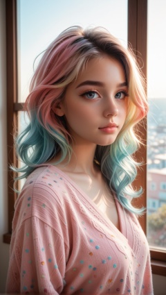 score_9, score_8_up, score_7_up, nsfw,style girl standing by a window, soft natural lighting, pastel hair with realistic strands, detailed skin texture, warm highlights, expressive large eyes, subtle reflection in glass, casual homewear, cozy atmosphere, photo-realistic shading