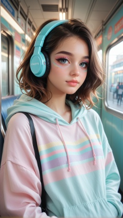 score_9, score_8_up, score_7_up, nsfw,stylized anime girl wearing one headphones, subway background with soft blur, casual pastel hoodie, natural light reflections on skin, glossy eyes with subtle makeup, realism-inspired style, calm urban mood, high detail