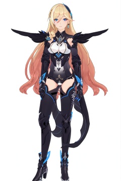 8k,best quality,masterpiece,(ultra-detailed),(high detailed skin),(by nanoless, by misumi \(macaroni\),:0.5),A full-body portrait of a young girl,standing gracefully,pastel art style,high-key lighting,shoujo manga influence,hd quality,delicate details,full body,full shot,standing,looking at viewer,(solo:1.2),simple background,(white background:1.2),<lora:Durandal-PalatinusEquinox-sd-Tanger:0.8>,Durandal \(Palatinus Equinox\) dark,clothes: black style armor suit,black style thigh boots,black style Durandal,black Feather decoration on the right shoulder,1girl,blonde hair,long hair,blue eyes,breasts,earrings,elbow gloves,jewelry,single left black mechanical wing,single wing,