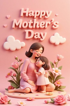 Ultra photoreal, Insane Details, 32K, 3D,Mother's Day,3D,this 3D clay-style Mother's Day poster features warm and bright colors. In the center of the image,a mother and child are affectionately embracing,meticulously crafted in clay with realistic details and overflowing love. Surrounding them are clay flowers,vivid and lifelike. In the upper right corner,"Mother's Day" is presented in artistic font,as if the letters were three-dimensional carvings,adding a festive atmosphere to the image and conveying deep maternal love.,..,3D,mother and daughter