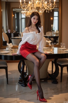 Realistic photo of a young woman with long hair, fair skin, big breast, off-shoulder shirt, short pencil skirt, shiny pantyhose, long legs, red high heels, full body, sitting on a large mirror dining table, luxurious dining room,