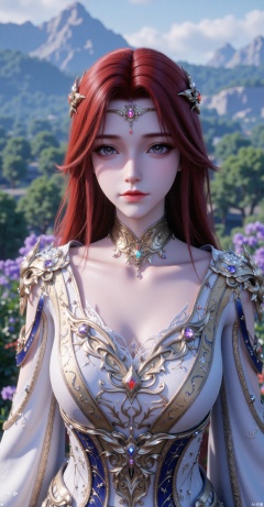 A red - haired woman with delicate features has her long hair cascading over her pointed shoulders. She has calm eyes and wears a gorgeous golden gemstone hair ornament. She is dressed in a white - toned fantasy - style long dress adorned with golden patterns, blue trimmings and colorful gemstones, and there are metal armor decorations on her shoulders. The background is a lush forest, distant mountains and purple flowers and plants. The sunlight filters through the leaves to form beautiful light and shadows. The overall color is bright, with a style between fantasy and classical, high in detail, 8K ultra - high definition, with a soft - focus effect and rendered by Unreal Engine, with movie - level lighting.