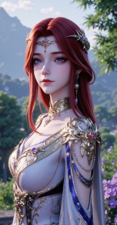 A red - haired woman with delicate features has her long hair cascading over her pointed shoulders. She has calm eyes and wears a gorgeous golden gemstone hair ornament. She is dressed in a white - toned fantasy - style long dress adorned with golden patterns, blue trimmings and colorful gemstones, and there are metal armor decorations on her shoulders. The background is a lush forest, distant mountains and purple flowers and plants. The sunlight filters through the leaves to form beautiful light and shadows. The overall color is bright, with a style between fantasy and classical, high in detail, 8K ultra - high definition, with a soft - focus effect and rendered by Unreal Engine, with movie - level lighting.