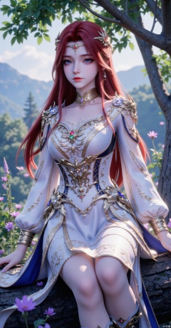 A delicate - featured red - haired woman with long hair draped over her shoulders and a serene gaze. She wears a华丽的(gorgeous) golden gemstone hairpiece and a white - based fantasy - style long dress adorned with golden patterns, blue trim, and colorful gemstones. Metal armor decorates her shoulders. The background is a lush forest, distant mountains, and purple flowers and plants. Sunlight filters through the leaves to create a beautiful light and shadow. From a full - body perspective, she sits on a tree, showing her slender legs in boots. The overall color is bright, with a style between fantasy and classical, high in detail, 8K ultra - high definition, with a soft focus effect and rendered by Unreal Engine with cinematic lighting.