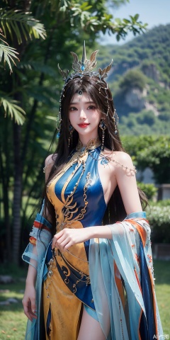 1girl, solo, long hair, brown hair, black hair, hair ornament, dress, jewelry, blue dress, chinese clothes, forehead mark,huangnv