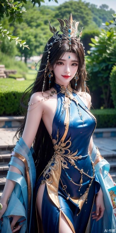 1girl, solo, long hair, brown hair, black hair, hair ornament, dress, jewelry, blue dress, chinese clothes, forehead mark,huangnv