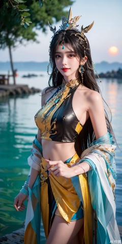 1girl, solo, long hair, , looking at viewer, skirt, hair ornament, bare shoulders, jewelry, , black hair, earrings, outdoors, midriff, water, necklace, lips, crop top, grey eyes, leaning forward, ocean, white skirt, strapless vest, sunset, sun,huangnv,chinese clothes