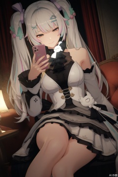 masterpiece,bestquality,4k,3d,animescreencap,{{masterpiece}},illustration,best quality,extremely detailed cg unity 8k wallpaper,original,high resolution,{{{{{extremely delicate and beautiful girl}}}}},karenina/(PGR),1girl, solo, long hair, breasts,bangs, skirt, hair ornament, long sleeves, dress, bare shoulders, twintails, white hair, multicolored hair, frills, detached sleeves, sleeveless,back stage,relaxing,curtain,phone,Looking at the phone,holding phone,front view,smile,