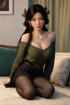 score_9_up,score_8_up,score_7_up,(Best quality, masterpiece, 4K),1girl, solo, long hair, big breasts,( off-shoulder sweater:1.3 ),(black pleated_skirt:1.3) ,indoor,looking at viewer, brown eyes,  lips, sitting,couch,black pantyhose , black hair,hair ornament,MeiNing