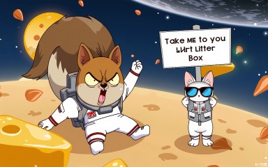 A flustered squirrel in a tiny astronaut suit spins wildly, antennae twitching, as a calm alien cat wearing sunglasses floats nearby, holding a "Take Me to Your Litter Box" sign, amidst floating cheese-moon craters and carrot-rocket debris.