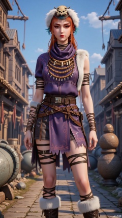 The character wears a purple top, paired with a dark inner layer and a shawl decorated with plush. The clothes have unique patterns. The lower body is dressed in a skirt of uneven lengths, with a high slit on one side revealing the leg, paired with legwear decorated with black straps and boots with plush edges. The overall style not only fits the body curves but also has the characteristics of the primitive tribal and fantasy styles.