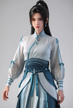 score_9,high detail,best quality,cinematic lighting,volumetric lighting,shiny skin,shiny,ningyao,1girl,solo,brown_eyes,earrings,white background,black hair,jewelry,long hair,hair_ornament,breasts,sash,dress,long sleeves,expressionless,ponytail,simple background,white dress,realistic,ponytail,hair ribbon,looking_at_viewer,thighs,<lora:QQSponyningyaoV1:0.8>,<lora:Pony_DetailV2.0:0.8>,<lora:皮肤凹痕:0.1>,