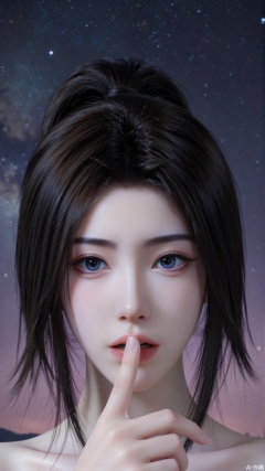 A girl, single, with black hair, a high ponytail, bangs, frowns, squints, pouts, blows, blue star eyes, long eyelashes, pink lips, her index finger sticking out one hand over her mouth, her eyes looking up, and an angry expression. The starry sky background has a magnificent and splendid picture quality, with a purple Milky Way.