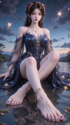 a serene and ethereal scene featuring a woman sitting in a reflective water body. She is dressed in a flowing, dark blue gown adorned with star motifs, and her hair is styled elegantly. Her feet are bare, adorned with delicate anklets and bracelets, and her nails are painted a glossy blue. The background is a twilight sky filled with stars, creating a magical and tranquil atmosphere. The overall aesthetic is dreamy and otherworldly, with a focus on the interplay of light and water.