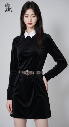 RUNYAN, RUNYAN Wearing a black velvet dress with a white neckline and a metal belt around her waist. She has fair skin red lipstick and a stony expression.