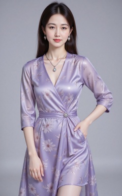 RUNYAN, RUNYAN She wore a lavender satin floral dress with a silver necklace and dangling earrings.