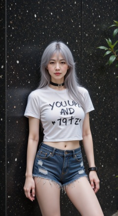 RUNYAN, RUNYAN wearing a white straw top with black writing on it ripped denim shorts ripped denim shorts a black choker and a bracelet. She stood by a wall of black speckledLong straight silver hair wearing a white straw top with black writing on it a black choker and a bracelet. She stood by a wall of black speckledLong straight silver hair ripped denim shorts wearing a white straw top with black writing on it Long straight silver hair a black choker and a bracelet. She stood by a wall of black speckled