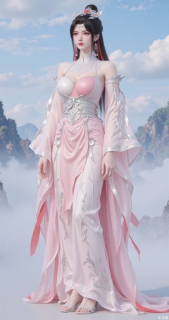 The woman is standing in front of a mountain landscape, with the sky and clouds visible in the background