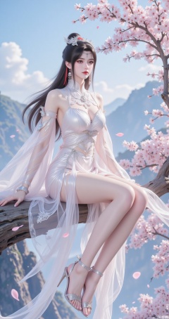 The image is a digital illustration of a young woman sitting on a tree branch with pink cherry blossom trees in the background