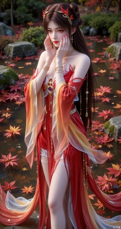 The background features a tranquil pond with floating autumn leaves, adding to the peaceful and mystical atmosphere of the scene