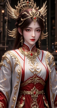 The character is adorned with intricate gold and red designs on their clothing, which includes a high collar and elaborate patterns