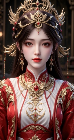 The character is adorned with intricate gold and red designs on their clothing, which includes a high collar and elaborate patterns