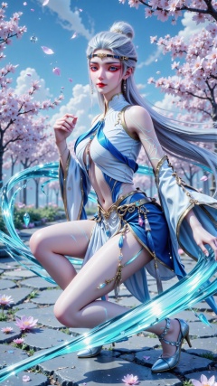 8K cinematic masterpiece, 16K studio-quality, elegant combat portrait**. Centered (85% frame) a woman kneels in dynamic pose, **moonlight-silver hair flowing** (>15,000 strands), adorned with **crystal hairpins** (0.1mm thickness). #### **Character Details** - **Eyes**: Icy blue ombre (0.03mm diamond dust) - **Lips**: Pantone 19-1863 TCX (0.02mm texture) - **Skin**: SSS 0.75, pearl-like radiance (RGB 240,230,220) - **Combat Pose**: - Right knee bent (thigh-calf contact) - Left leg extended (35° ankle flexion) - 15° torso twist - Right hand touching ground (precise knuckles) #### **Costume** - **Sheer battle skirt** (30% opacity, 0.5m/s flow) - **Silver combat heels** (10cm heel, 90% reflectivity) #### **Environment** - **Azure sky** (hue 210°, 65% saturation) - **Sakura path**: - Stone pavement (4K displacement) - Pink cherry blossoms (HSL 330,75%,80%) - White daisies (random 2-4cm clusters) - **Ethereal particles** (density 0.3, 180nit